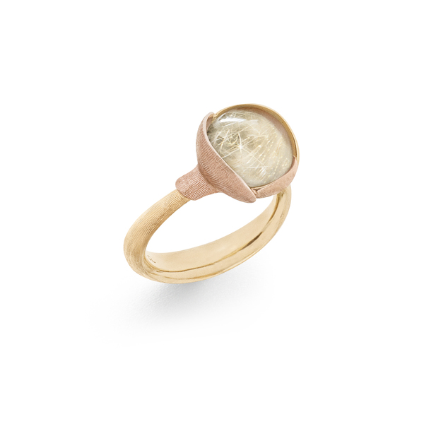 Bague Lotus size 2, or jaune 18 carats, feuilles en or rose, Rutile quartz cabochon .