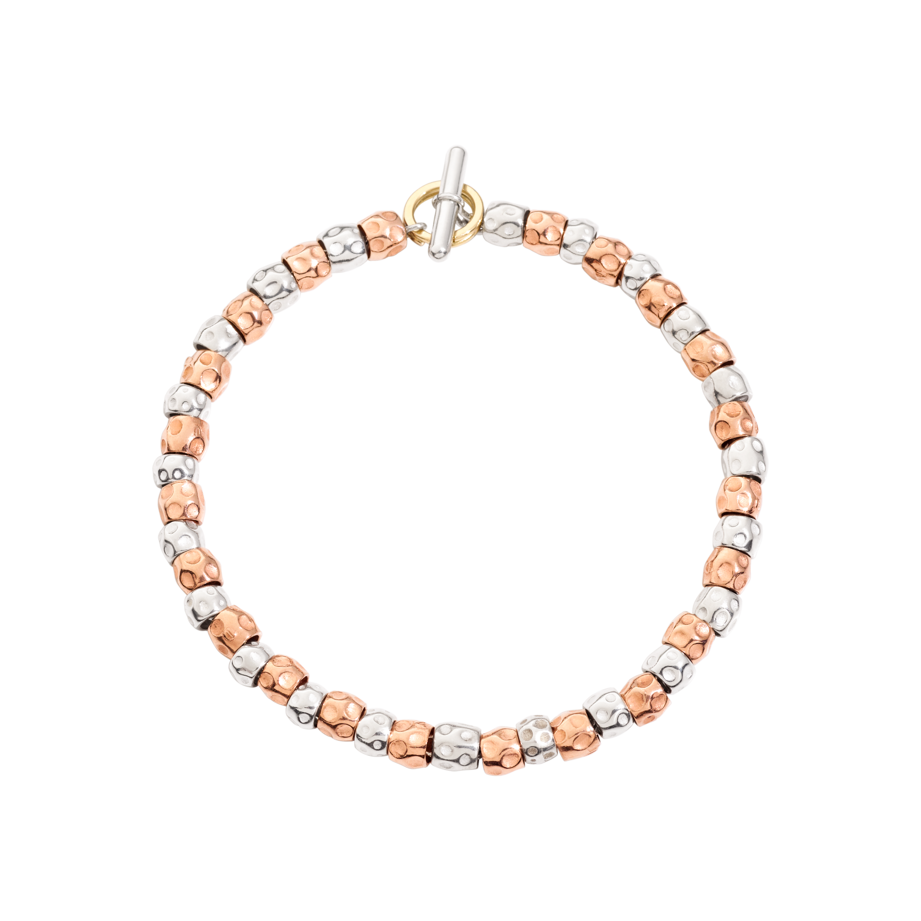 Bracelet Granelli argent et or rose 9 carats, anneau brisé en or jaune 18 carats.